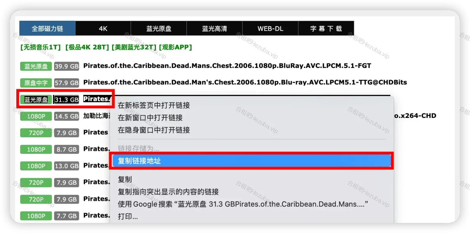 打开影视的详细页面后,翻到底部找到磁力链接地址。可选多种画质:蓝光原盘、4K、1080P等。选择想要下载的资源,在选中的资源右击鼠标选择复制链接地址。