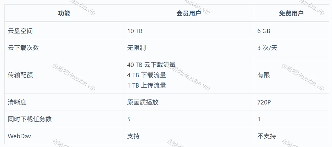 PikPak 针对免费用户与会员用户,是有不同限制的,体现在云盘空间、云下载次数以及传输配额上有明显的区别,具体区别可见如下表格: