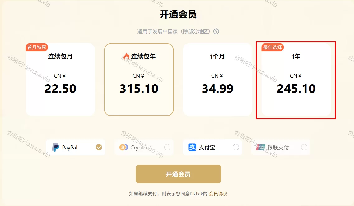 文章发布日期时,会员价格显示为:22.5元包月,245元包年,如果遇到活动可能价格会有折扣!建议参与本站的Pikpak会员合租,5人车仅需50元,即可上车!