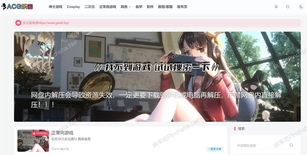 ACG乐园是一个分享ACG资源的网站,包含绅士游戏、正常向游戏、动画、次元漫画、Cosplay、二次元等网盘资源下载